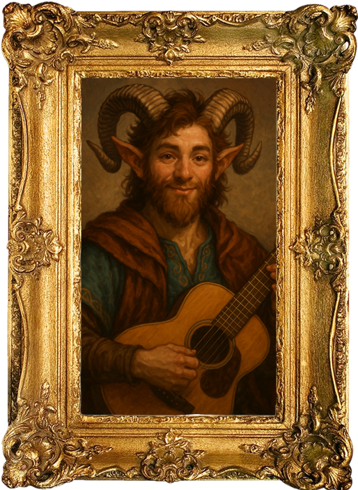 If Pherelar is the pulse, Dorian is the rhythm. A faun bard with goat legs, small horns, and an acoustic guitar strapped across his back. Mischief runs through him like a second bloodstream, and he hides wisdom behind a grin and a rhyme. Dorian was born of the friend who always keeps the mood alive, the one who makes jokes when things get too heavy, who insists there’s always music somewhere if you’re willing to listen. His songs turn danger into dance, his rhymes bend chaos into rhythm. Beneath his silliness lies courage, and more than once, he proves that a song can hold the world together just as surely as any shield.