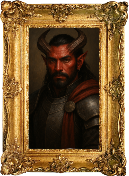 The third companion could not be more different. A tiefling paladin-warlock, his skin red, his horns curved, his eyes steady. He is discipline incarnate, the anchor to the others’ storm. Jarek was shaped from matter-of-fact nature, though I granted him something weightier—conflicting vows, radiant and dark, which force him to walk a razor’s edge. Where Pherelar wanders with curiosity and Dorian dances with words, Jarek stands firm. He is the voice that says stand when the world whispers falter. His sword is judgment, his shield is truth. And though he rarely laughs, his loyalty speaks louder than any jest.